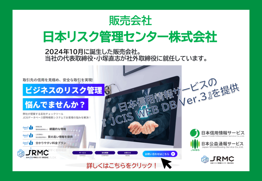 設立から間もない日本リスク管理センターにとって、日本信用情報サービスとの協働は、重要な布石です。「JCIS WEB DB Ver.3」の膨大な信用データと検索ツールという接点が、具体的な実務支援へと結び付き、導入企業の判断力と防衛力を強化しています。