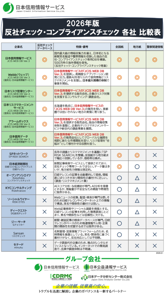 本比較表では、反社チェック・コンプライアンスチェックを実務レベルで提供している企業のみを掲載し、比較対象としています。