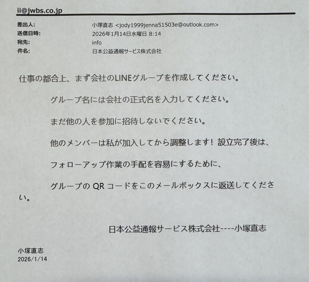 日本信用情報サービスのグループ会社である「日本公益通報サービス」にも、報道内容と一致する不審なメールが実際に届きました。弊社社長を名乗り、会社用のLINEグループ作成を指示され、QRコード画像の送信を求める、という内容です。