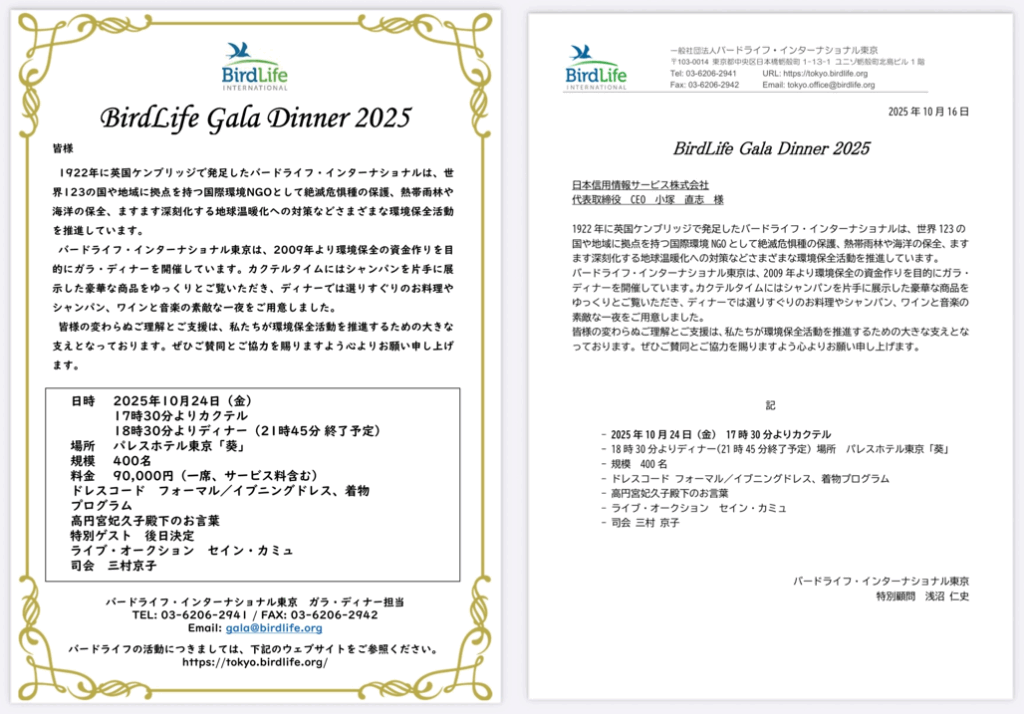 「BirdLife Gala Dinner 2025」への招待